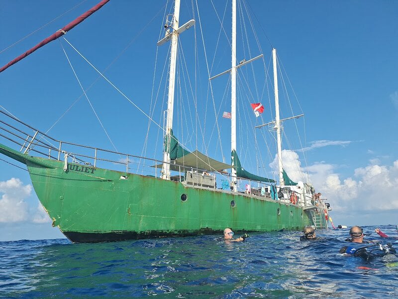 We sailed on the Juliet, a no-frills liveaboard focused on diving, not luxury. The ship, an older converted diesel vessel with rarely used sails, is functional but basic. The dive deck is mid-ship, requiring a five-foot jump into the water, with no low dive platform for easy reentry—climbing back up can be a workout.